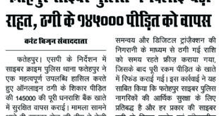 फतेहपुर साइबर पुलिस ने दिलाई बड़ी राहत — ठगी के ₹1,45,000/- पीड़ित को वापस फतेहपुर।एसपी के निर्देशन में साइबर क्राइम पुलिस थाना फतेहपुर ने एक महत्वपूर्ण उपलब्धि हासिल करते हुए ऑनलाइन ठगी के शिकार पीड़ित की ₹1,45,000/- की पूरी धनराशि बैंक खाते में सुरक्षित वापस कराई। मामला सामने आते ही …